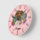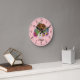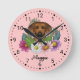 Destei's original cartoon illustration of an adorable Rhodesian Ridgeback breed dog's head close-up surrounded by colourful summer wildflowers. There is a blush pink flower, a purple flower, a dark pink flower and a white daisy flower together with some green leaves and branches. The background colour is pink with a light polka dot pattern. The background colour can be changed to any other colour and the polka dot pattern can be removed, if so wished. The hours are marked with numbers. The hours and minutes are shown with a dotted clock face. There is also a personalizable text area for a name or other custom text in a lovely script font.