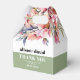 This wedding favor box displays a beautiful rhododendron branch adorned with delicate peach-pink flowers and greenery. The couple's names are elegantly displayed in bold typography, adding a personal touch to the design. A heartfelt 'Thank You' message is also included, expressing gratitude to the guests. Completing the look, a stylish sage green band adds a touch of sophistication at the bottom of the box.