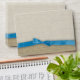 The look of burlap with a blue ribbon printed on this custom envelope. Matching invitations available.