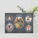Celebrate the season in style with this handcrafted holiday photo card, featuring a central ribbon-framed main photo surrounded by four smaller snapshots in charming botanical frames. The chic black chalkboard background brings warmth, while the reverse side’s delicate white floral pattern on dark green adds a touch of elegance. Personalise with your favourite family moments and spread holiday cheer with a heartfelt touch.