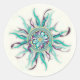 A colourful design featuring some of the most familiar symbols in Buddhism, the Dharma Wheel, Infinite Knot, and Lotus in mandala form surrounded by flowing ribbons in shades of turquoise, aqua, and purple with yellow accents.