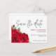 Rich red roses adorn the bottom left hand corner and Save The Date is in a stylish script set typography in black. The rest of the serif text is easily personalised to your own details. You may also be interested in our individual name and address guest stickers available in this collection to help with your wedding mailings!