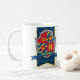 Richard name meaning shield red blue boys mug. Galiant royal crown knights style crest shield monogram letter R art name mug perfect for kids and teens in shades of red, blue, grey and yellow. Personalise with your own name beginning with R and name meaning or a message or subject for a personalised touch. Reads Richard A strong powerful ruler. Rich, courageous and valiant. Other names available on mugs and other matching products. Unique royal style crest drawing, featuring a lions head, crown, star and initial monogram R letter, graphic art and design by Sarah Trett www.sarahtrett.com for www.mylittleeden.com
