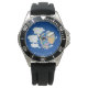 Has heft and feel of expensive stainless steel quartz wrist watches. Solid construction and good looks. Although it had a really top quality rubber strap, I substituted a stainless steel "Shark" style mesh strap, which I think is the most comfortable strap available. Perfect. True colors of original image. Clear, crisp image precisely aligned and spaced.