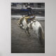 A cowboy riding a bucking bronco at a rodeo in Halifax, Nova Scotia