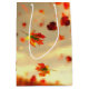 Against the backdrop of a lone maple in a hillside, bright orange and yellow autumn leaves float on the breeze.