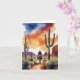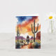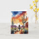 This greeting card features a watercolor painting of a cowboy riding through the American southwest at sunset.