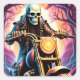 a skeleton gripped in pandemonium bike. Riding through the intertwining branches on the trail .He had a hopped-up .He has a black leather trousers and motorcycle boots And a black leather jacket with bone like design on the bilker outfit .With the sun going down behind him. Haze rising up from around him into the dark night he rids away with night stars above.