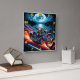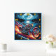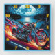 A dynamic motorcycle races along a moonlit lake, flames trailing behind, with a vibrant mix of colours and dramatic scenery enhancing the thrill of the journey.