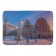 Sunset over covered in snow Riga Town Hall Square in winter in Riga, Latvia. View of famous House of the Blackheads and Roland's Statue against blue sky with sunset lights