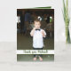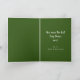 Thank you card for the ring bearer in a wedding. Add a photo of the little guy to the front of this vertical folded note card. Along the bottom, “Thank you [name]” and inside continue to the message telling him how great he did. Also add a printed signature. Dark forest green colour inside with white text.
