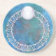 An ornate, stylised silver filigree ring studded with cloudy-white pearls and set with a single round white gem with a star glancing from its depths, set against a backdrop of watery blue fractals.