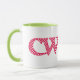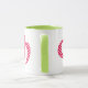 A fun Ringer Mug with a Green lip and handle and the Welsh word 'cwtch', meaning 'cuddle' or 'hug', in a Celtic script, filled with a bright Red and White Polka Dot pattern.