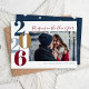 Affordable custom printed holiday cards with a simple template for customisation. Announce your holiday season engagement with this modern minimalist New Year photo card. The design features large typography with the new year date and "Ringing in the New Year" headline in burgundy, navy and gold colours. Personalise it with your photo and custom text. Use the design tools to choose any fonts and colour, add more photos and create a unique one of a kind New Year photo magnet.