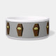 This awesome pet bowl features a creepy coffin made from wood with gold edging. The coffin lid is slightly open revealing only darkness within. The gold plaque on the front of the coffin has spooky black text on it that says RIP, giving no clue who or what might be lurking inside. This fun yet sinister coffin is ideal for Halloween. The bleak grey background acts to draw the eye of the observer towards the coffin of doom.