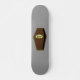 This awesome skateboard features a creepy coffin made from wood with gold edging. The coffin lid is slightly open revealing only darkness within. The gold plaque on the front of the coffin has spooky black text on it that says RIP, giving no clue who or what might be lurking inside. This fun yet sinister coffin is ideal for Halloween. The bleak grey background acts to draw the eye of the observer towards the coffin of doom.