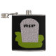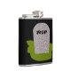 This awesome flask features a grey tombstone with RIP in dripping black text on it, standing on a patch of green grass. Befitting of this morbid design the background is black.