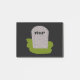 This awesome pad of post it notes features a grey tombstone with RIP in dripping black text on it, standing on a patch of green grass. Befitting of this morbid design the background is black.