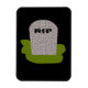 This awesome magnet features a grey tombstone with RIP in dripping black text on it, standing on a patch of green grass. Befitting of this morbid design the background is black.