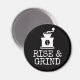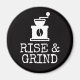 Fun coffee lover design featuring a coffee grinder and the slogan "Rise & Grind".