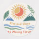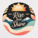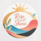 A vibrant and uplifting illustration featuring the phrase “Rise and Shine” in a warm red-orange gradient cursive font. Above the text, a golden sun radiates outward, symbolising energy and renewal. Below, abstract hills in blue, green, red, and black flow across the landscape, flanked by stylised leaves on both sides. The harmonious blend of natural elements and vivid colours creates a positive, inspiring visual that encourages viewers to start their day with optimism and vitality.