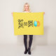 A fleece blanket with a cute typographical design. A fluffy cloud and an orange sun.