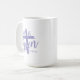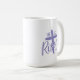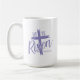 Coffee mug is shown in purple and white with a He Is Risen print.