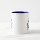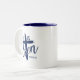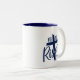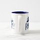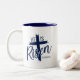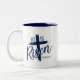 Coffee mug is shown in navy and white with a He Is Risen print.