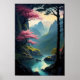 Discover a world of serene beauty within the embrace of nature's masterpiece. A small river meanders peacefully through a canyon, its gentle flow a soothing melody. Tall cliffs stand guard, their majestic presence creating a sense of awe. Overgrown with lush flora, the cliffs come alive with vibrant colours. This digital artwork captures the harmony of water, stone, and life.