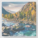 A stone coaster with a scenic photograph featuring tree covered mountains in autumn colours. A vibrant river flows around a multitude of rocks.