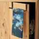 A kitchen towel with a scenic photograph featuring tree covered mountains in autumn colours. A vibrant river flows around a multitude of rocks. A large white full moon hovers above.