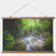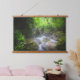 Landscape photograph of a stunning river flowing through an enchanted green forest with spring flowers around mossy green river bank.