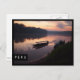 Postcard with a boat on the Tambopata river in the Amazon rainforest in eastern Peru near the Brazilian border during sunrise with a black edge and the text: 'Peru'.