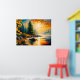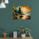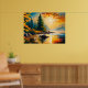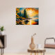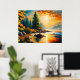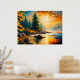 A serene river painting graces the living room, depicting a tranquil scene of a rocky riverbank surrounded by a pine forest in the midst of autumn. Created with rich oil paints, the artwork captures the warm hues of a sunlit afternoon, casting a golden glow on the landscape. This portrayal of nature's beauty, where the river peacefully winds its way through the rocky terrain, embraces the enchanting essence of a forested sunset landscape, inviting viewers to find solace in the harmony of earth and water.