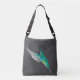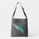 Dark grey crossbody bag featuring a Rivoli's Hummingbird. The Rivoli's Hummingbird is a large, long-billed hummingbird native to the mountains of southeast Arizona to the Chisos Mountains in Texas and middle to high elevations throughout much of Mexico and Central America.