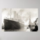 This is another view of the great ship leaving port. In this particular photo she has pulled away from the wharf. A steam tug is just visible on her starboard side.