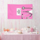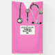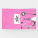 Creative nursing school graduation congratulations party banner featuring pink hospital scrubs, funny Swiss army knife and stethoscope. Edit text to add the name and medical credentials of your favourite nurse grad.