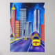 Colourful drawing of a road with cars on going through the city. This is a AI generated art.