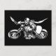 Drawing of a skeleton pirate riding a motorcycle with his scabbard drawn. Black & white, and red/blue versions, on t-shirts, hoodies, cards, gifts.