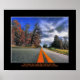 A vibrantly coloured artistic image of the road close up with fall trees in the far ground and a black border, featuring the quote “You know you're on the road to success, when you realise that failure is only a detour.”