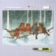 A group of five European robin birds sit on a branch in a snowy evergreen and birch tree forest. Great for Christmas holiday decoupage projects and other winter crafts.