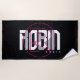 This graphic offers a contemporary reinterpretation of the Robin emblem, blending classic elements with modern design sensibilities. The logo centres around a bold, geometric depiction of the word "ROBIN," set in stark white against a deep black background, encapsulated within a striking pink circle that adds a dynamic visual contrast. The circle not only frames the text but also breaks through it, suggesting Robin's emergence from the shadow of Batman to establish his own identity. The use of pink adds an unexpected twist, lending a fresh and modern vibe while still paying homage to the traditional red associated with Robin. This design captures the essence of Robin's evolution as a character, blending his heroic legacy with a sleek, urban aesthetic suitable for a new generation of fans.