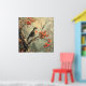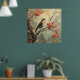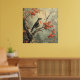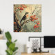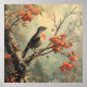 Beautiful nature vintage lithography of a robin redbreast on a tree branch with pink flowers and red berries, soft delicate colours in Japanese style