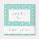 Crisp white polka dots with that perfect shade of turquoise; not quite blue, not quite green, but very much the classic robins egg colour of a certain jeweller! What a gorgeous, classic design this is. We offer it on a variety of products so you can match your announcements and cards to the colours of your wedding.