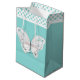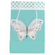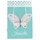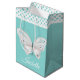 Chic custom medium sized gift bag done in robin's egg blue, with graphics of a pretty white butterfly, on the front and back, and polka dot band, around the top. Personalise the white text, on the front of the bag, to read what you want. Great gift bag and matching tissue paper is available.
