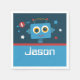 Cute personalised happy 1st birthday paper napkins with colourful robot surrounded by stars, with giant eyes and antennae on his head. A planet has a number 1 and customisable name. PinkInkArt original!