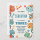 Gear up for your little one’s big third birthday with this fun and colourful robot-themed invitation! Designed with eight playful watercolor robots peeking in from all four sides, this 5x7 inch vertical card is perfect for toddlers who love machines, gears, and gadgets. A bright mix of primary colours and scattered mechanical elements like wrenches and gears adds a whimsical STEM twist.