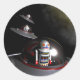 A group of 3 retro Toy Robot - 7's fly saucers around a small moon