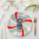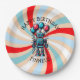 Personalised boy's happy birthday paper plates with a robot theme. Colours are blue, red and black. A cartoon robot holding up red and blue balloons. Cute for any little boy who loves robots!