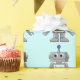 This wrapping paper features smiling robots, on a customisable blue green background.